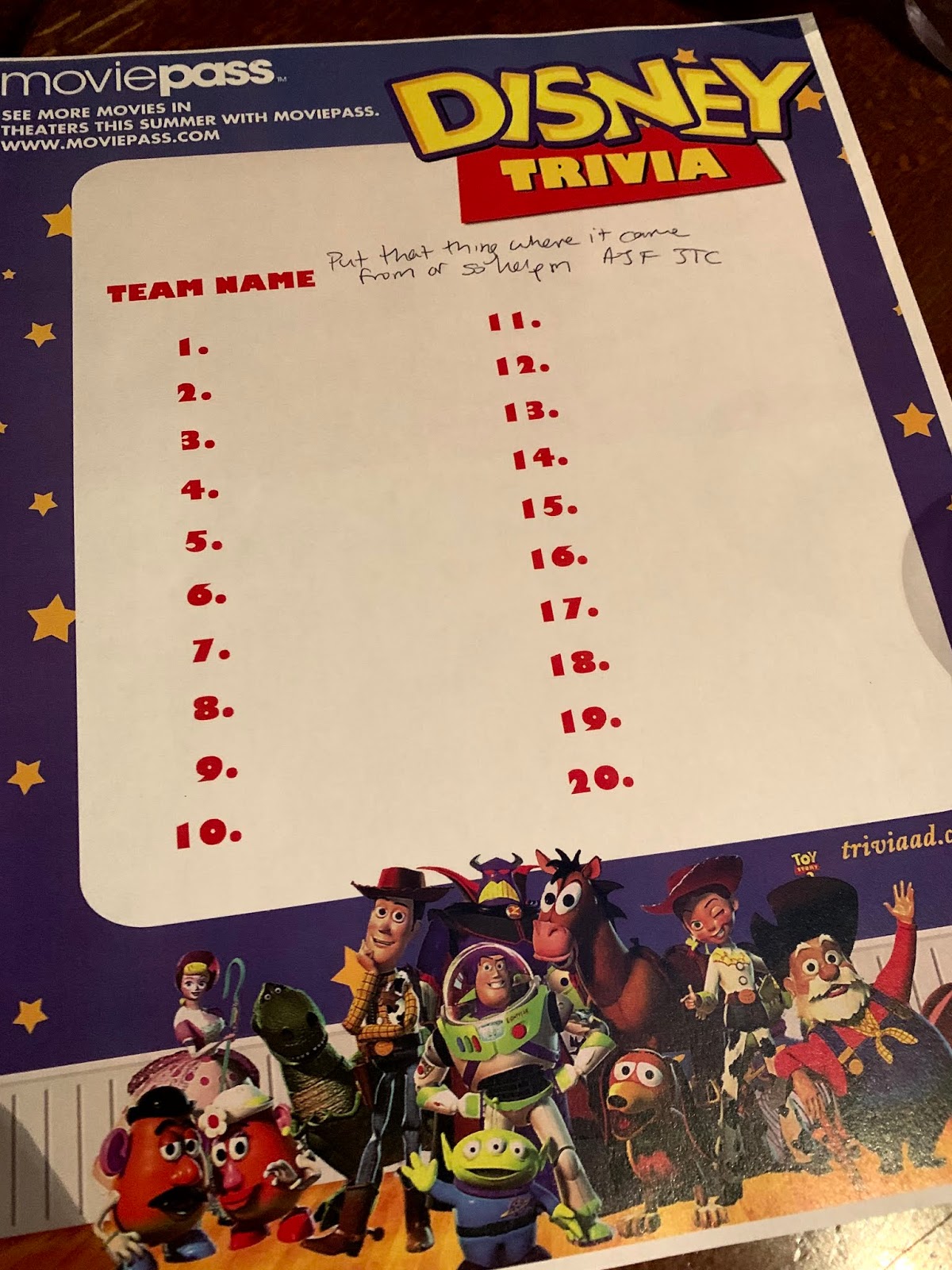 A local bar had a Disney movie trivia night, so you better bet we were there! We came in 4th place and were very proud of ourselves. Our team name (Put that thing back where it came from or so help me) was a big hit.